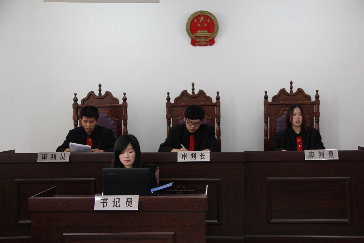 模拟法庭实验室面积约100平方米,可容纳100名左右的学生同时上实训课。实验室配备了法台3张,法椅3把,法桌5张,法椅7把,法袍、检察官服、律师袍、警服、徽章、标牌若干,基本能够满足实训课程及学生第二课堂、大学生辩论等用途的需要。