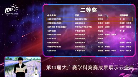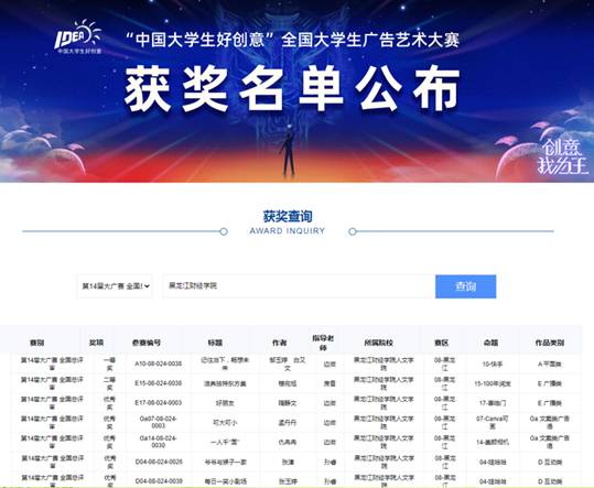 近日,第十四届全国大学生广告艺术大赛颁奖盛典云端举行,我校广告学专业学生获得全国一等奖1项、全国二等奖1项、全国优秀奖5项;省级一等奖4项、省级二等奖14项、省级三等奖39项、省级优秀奖109项。这是我校第二次在“大广赛”国赛中获得一等奖,此次比赛黑龙江省只有两所院校获此殊荣,另一所是哈尔滨工业大学。
