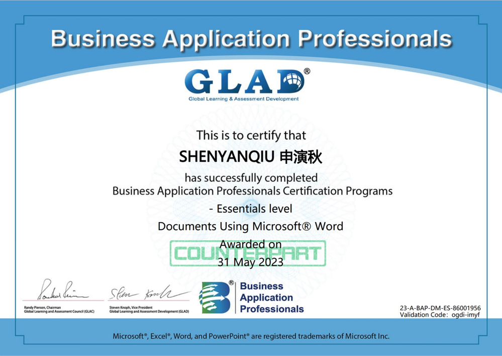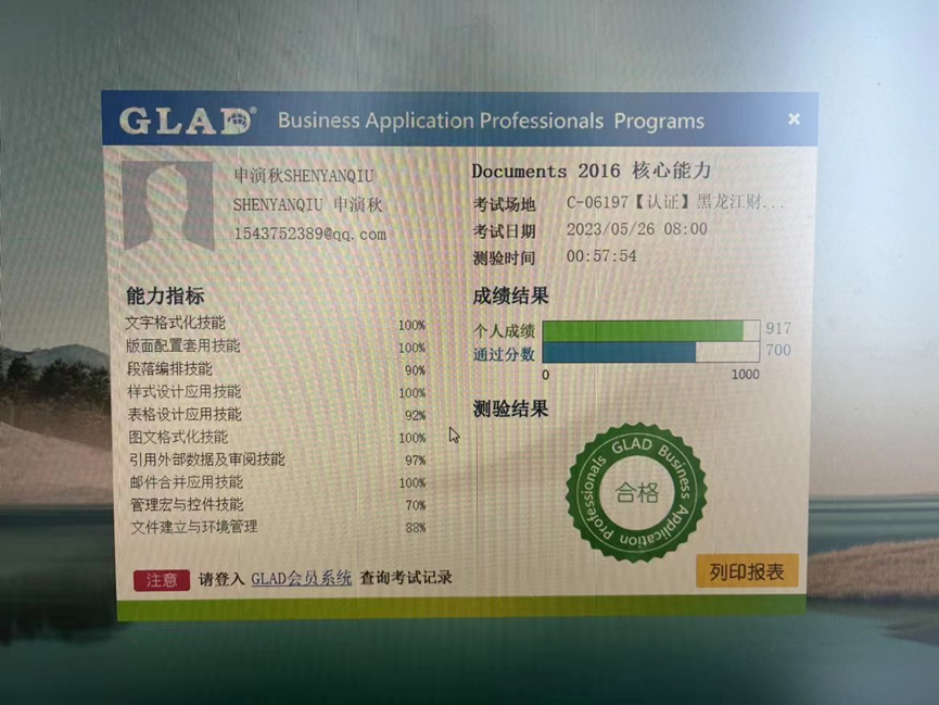 大赛共分为信息技术素养赛项,商业智能与数据分析赛项,办公技能应用赛项等三类6个赛项,每个赛项分别分本科组和高职组两个组别。电子信息工程专业张佳乐、数据科学与大数据技术申演秋两名学生分别以初赛成绩816分和917分获得GLAD国际认证证书并晋级复赛,最终取得国赛三等奖的好成绩。