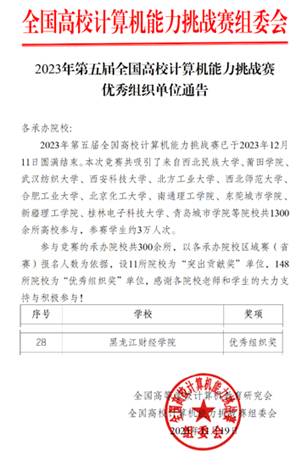 牛灿同学获全国一等奖,胡艺菲、王飞懿、石全、郑德阳、闫舒桐、申演秋、牛灿等7名同学获全国二等奖,李金兰、鲁宇鑫、冯墨林、赵如意、李金霞、王茗茗、赵佳媛、唐东旭等8名同学获全国三等奖,黑龙江财经学院财经信息工程学院被评为“优秀组织单位”。
