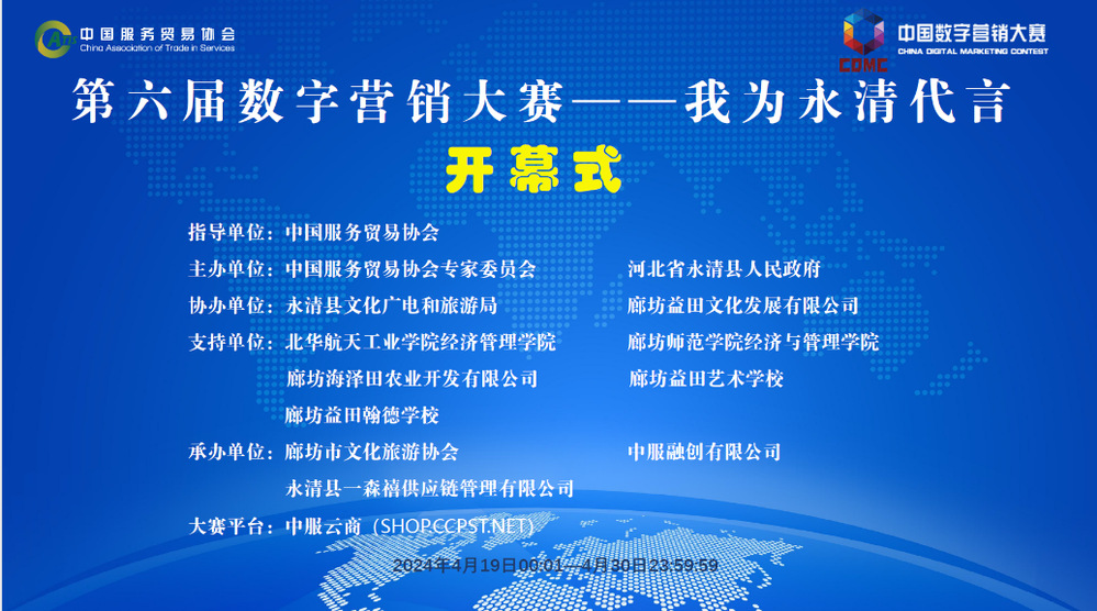 为深入贯彻落实十九届六中全会精神,扩大商品和服务消费,巩固拓展脱贫攻坚成果,衔接推进乡村振兴,中国服务贸易协会启动了数字助力乡村振兴行动计划,并由中国服务贸易协会专家委员会、中服云商共同发起举办“数字营销大赛”,借助电商新模式以赛事方式定点销售县域特色产品(原国家级贫困县优先),希望通过举办大赛进一步扩大该地区知名度、品牌影响力,实现特色产品“出村进城”。2024年4月19日,第六届数字营销大赛——我为永清代言正式比赛,直播赛道线下赛段正式开赛。参赛团队来自51所高校及60余家企事业单位,共计560余个团队、1700余名选手报名参赛。
