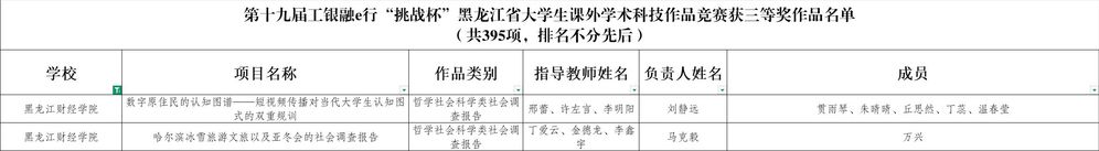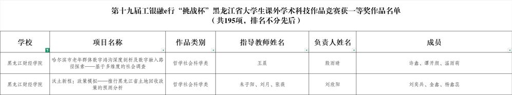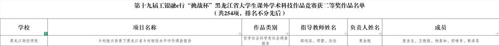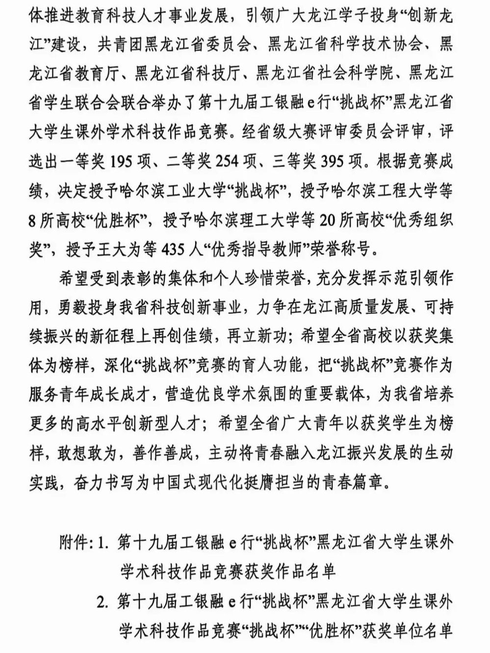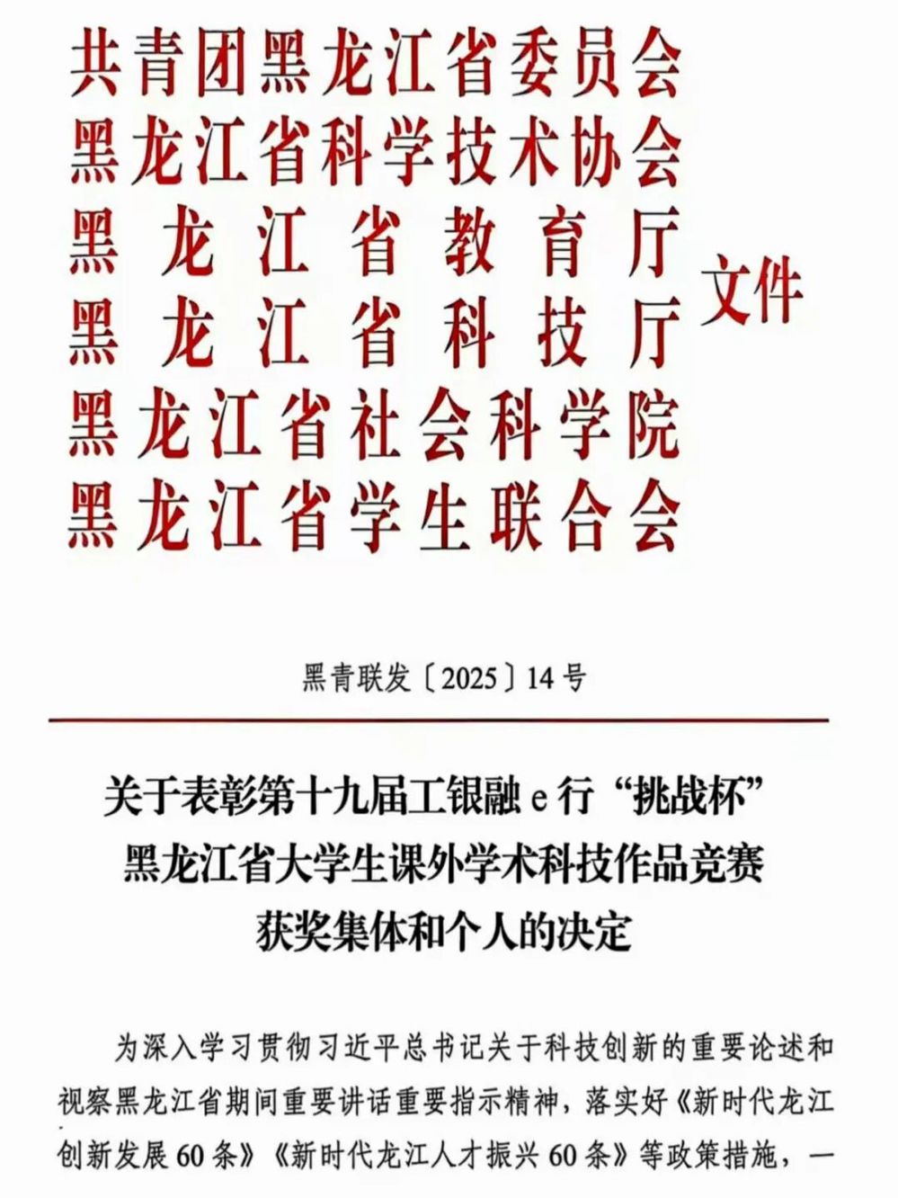 近日,团省委、省教育厅、省科技厅、省社科院、省科协、省学联联合发布《关于表彰第十九届工银融e行“挑战杯”黑龙江省大学生课外学术科技作品竞赛获奖集体和个人的决定》。我校在本届竞赛中表现优异,获省级一等奖2项、二等奖1项、三等奖2项。