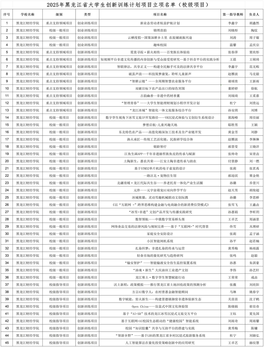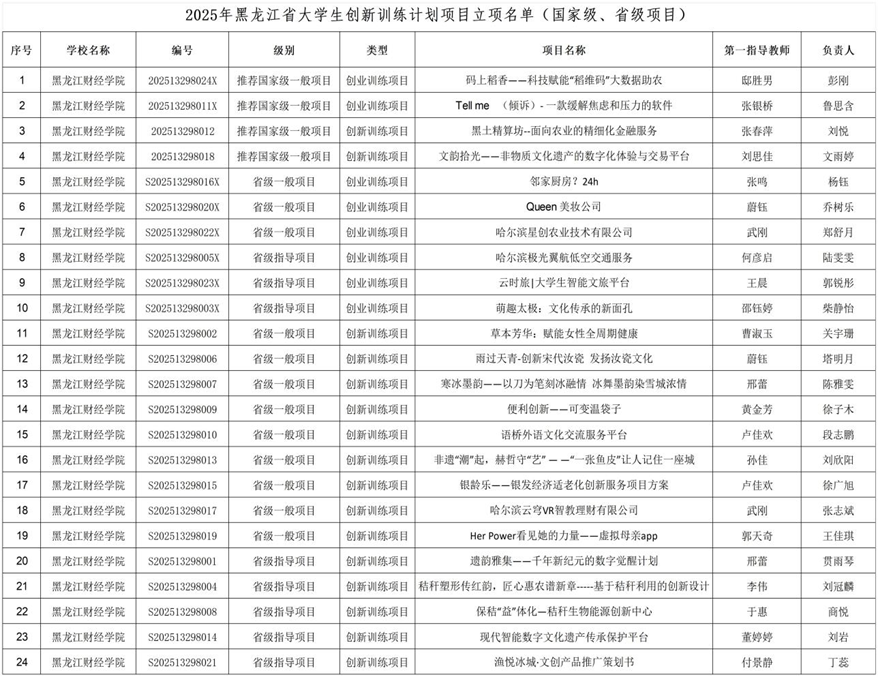 近日,黑龙江省教育厅公布了2025年黑龙江省大学生创新训练计划项目立项结果,我校共计获批省级以上立项项目24项(其中包括国家级一般项目4项、省级一般项目12项、省级指导项目8项),校级项目45项。现将立项名单予以公布: