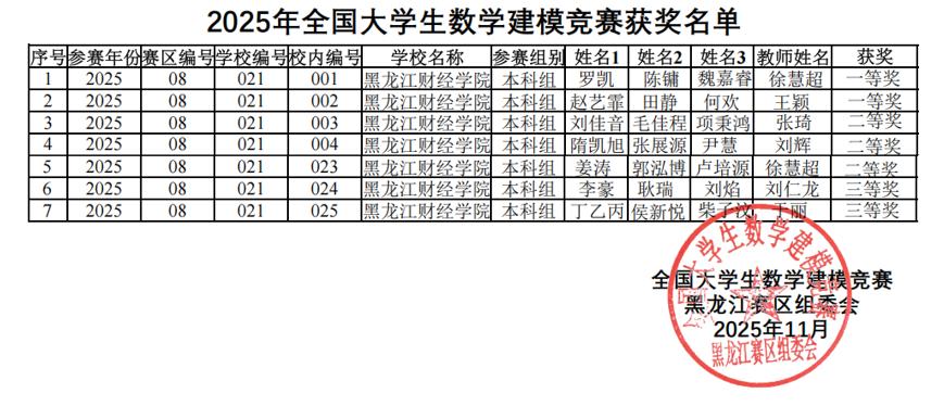 “2025年高教社杯全国大学生数学建模竞赛”于2025年9月4日18:00至9月7日20:00举行,我校代表队在逾20万名学子的激烈角逐中,凭借扎实的数学功底、出色的跨学科应用能力与高效的团队协作,斩获优异成绩。经黑龙江赛区评阅,获得省级一等奖2项,省级二等奖3项,省级三等奖2项。