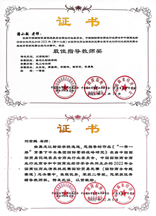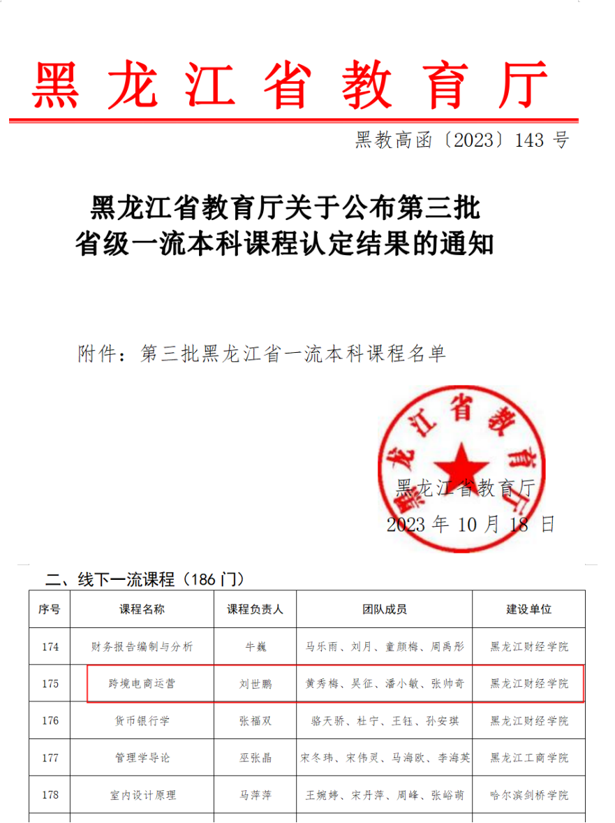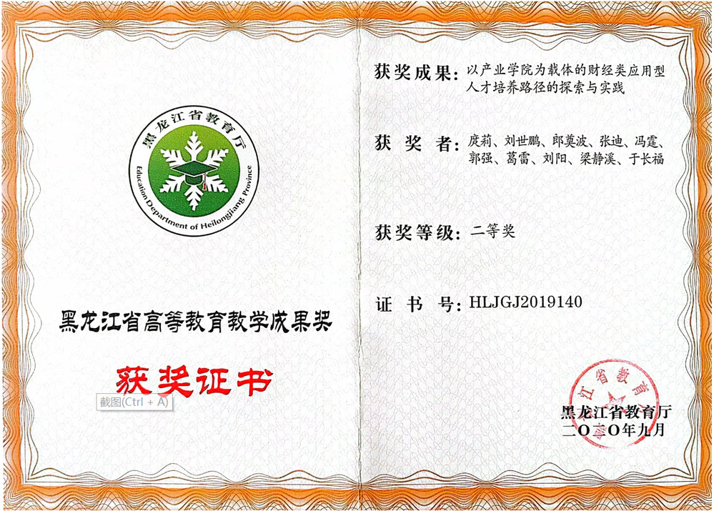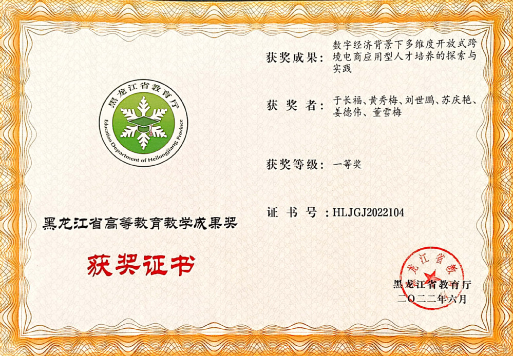 “跨境电商运营”、“电商创业实操”、“产品数据营销课程”三门课程教学改革实践获得龙江省高校教师教学创新大赛一等奖2项、二等奖2项,“跨境电商运营”课程为黑龙江省线下一流课程、课程思政示范课、产教融合示范课程,省优秀课程思政案例1项。