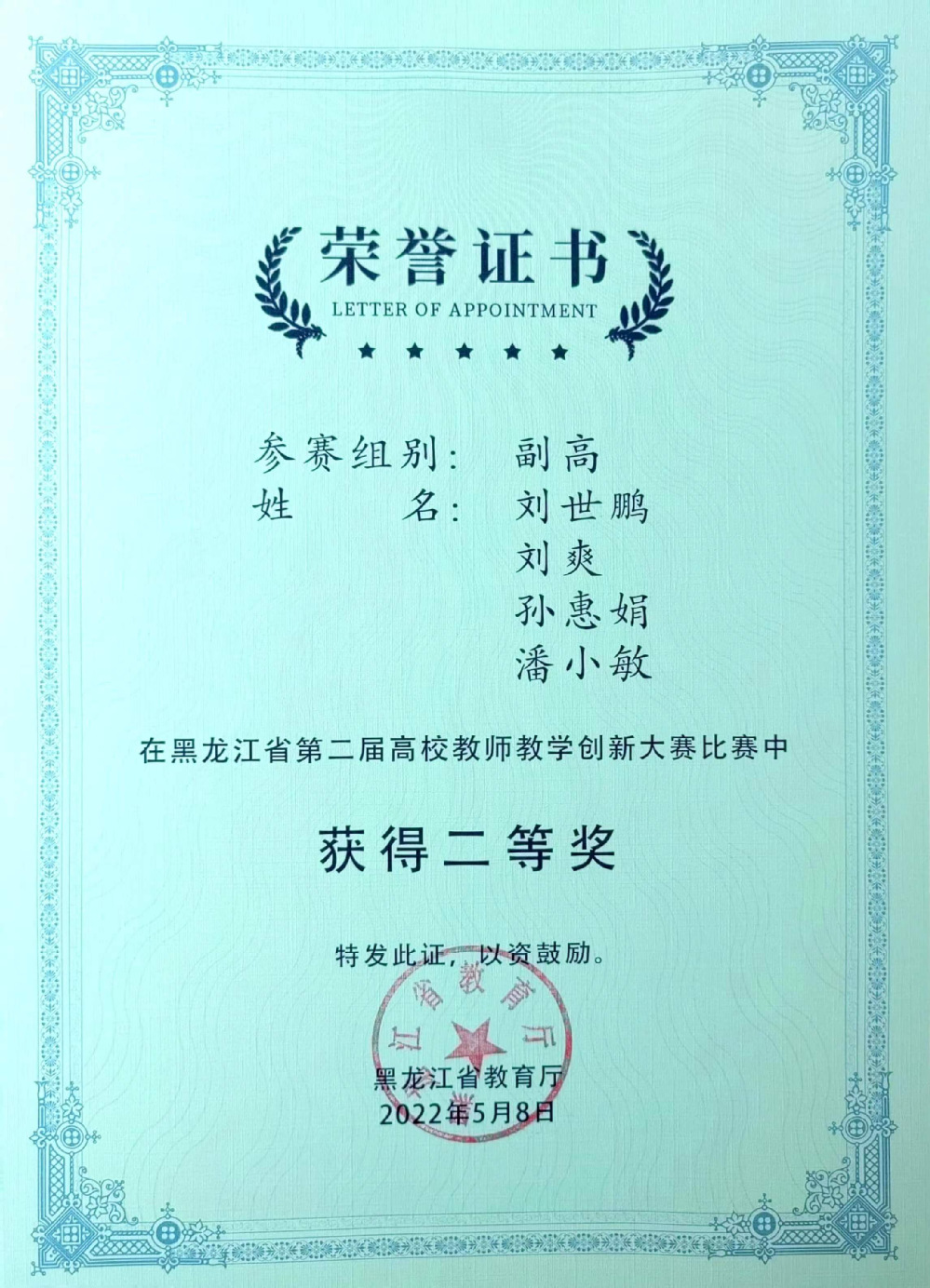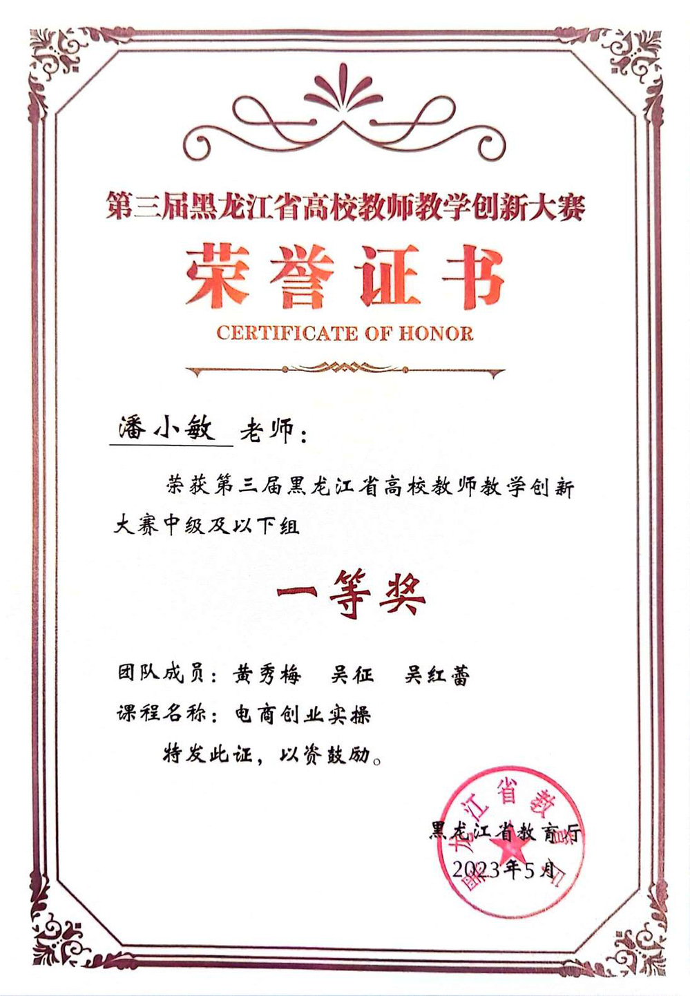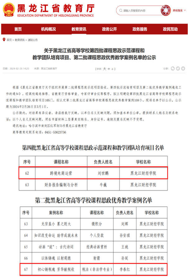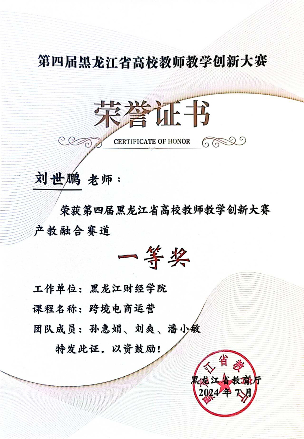 “跨境电商运营”、“电商创业实操”、“产品数据营销课程”三门课程教学改革实践获得龙江省高校教师教学创新大赛一等奖2项、二等奖2项,“跨境电商运营”课程为黑龙江省线下一流课程、课程思政示范课、产教融合示范课程,省优秀课程思政案例1项。