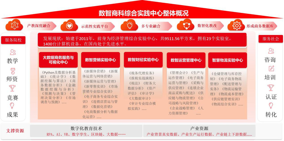 数智商科综合实践中心始建于2011年,前身为经济管理综合实验中心,共9511.56平方米,拥有23个实验室,1400台计算机设备,在国内处于先进水平。拥有MICD数据中心、基于Python的大数据采集与清洗系统、商务智能数据分析与挖掘系统、预测与决策平台、统计学基础与实务、新媒体营销平台、数智商贸综合实战平台、零售门店020运营、数字化营销实验平台、数字化运营分析平台、数字化税务实战平台、财务大数据实验平台、资产评估仿真实践平台、大数据审计实训软件、数智化综合仓储实训平台、数智化综合配送实训平台、数智化综合运输实训平台、物流成本管理会计实训平台、物流大数据分析系统、智慧运营管理决策平台、采购与供应链成本管理平台、智能风控与战略管理平台等51套教学软件,为学生实践提供全面系统的教学条件。